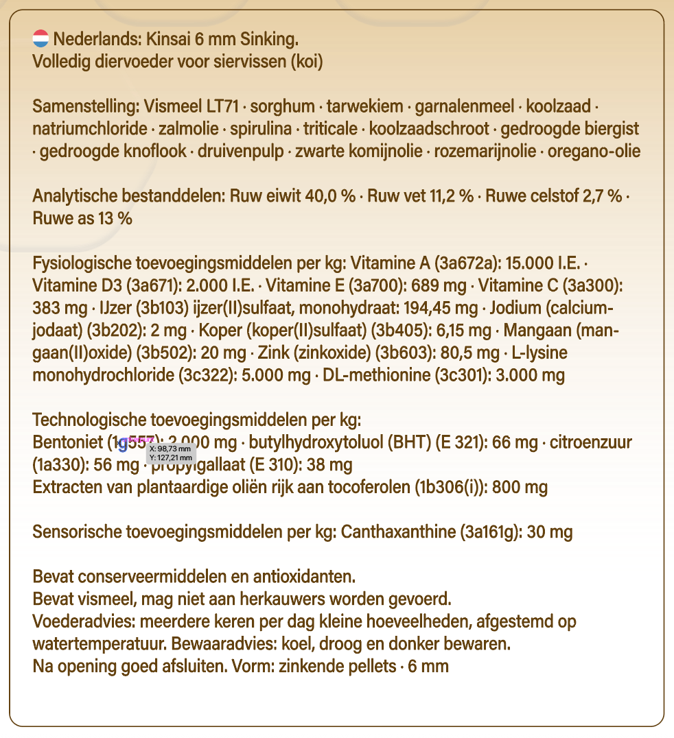 De basis van Kinsai bestaat uit zorgvuldig geselecteerde ingrediënten zoals zeer hoogwaardig Arctisch vismeel en zalmolie, aangevuld met spirulina en natuurlijke kleurstoffen. Deze samenstelling ondersteunt niet alleen een diepe, intense kleuring, maar draagt ook bij aan een sterke vitaliteit en een goede algehele conditie.