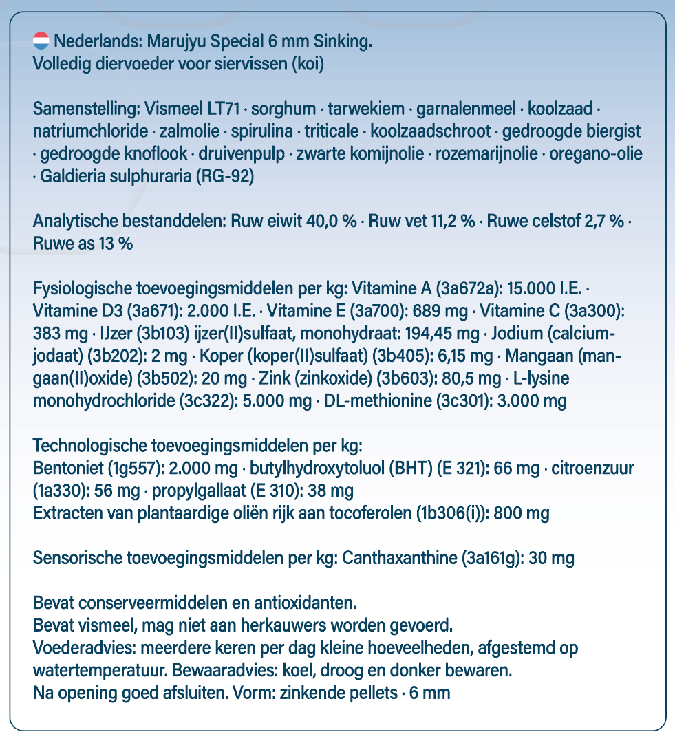 Onze conclusie: RG-92 kan daadwerkelijk een duidelijke meerwaarde betekenen ten opzichte van ons bestaande Kinsai-voer. Omdat RG-92 een merkbare invloed heeft op de kostprijs, hebben we bewust gekozen voor transparantie. Daarom introduceren we naast Kinsai, het Marujyu Special voer:
